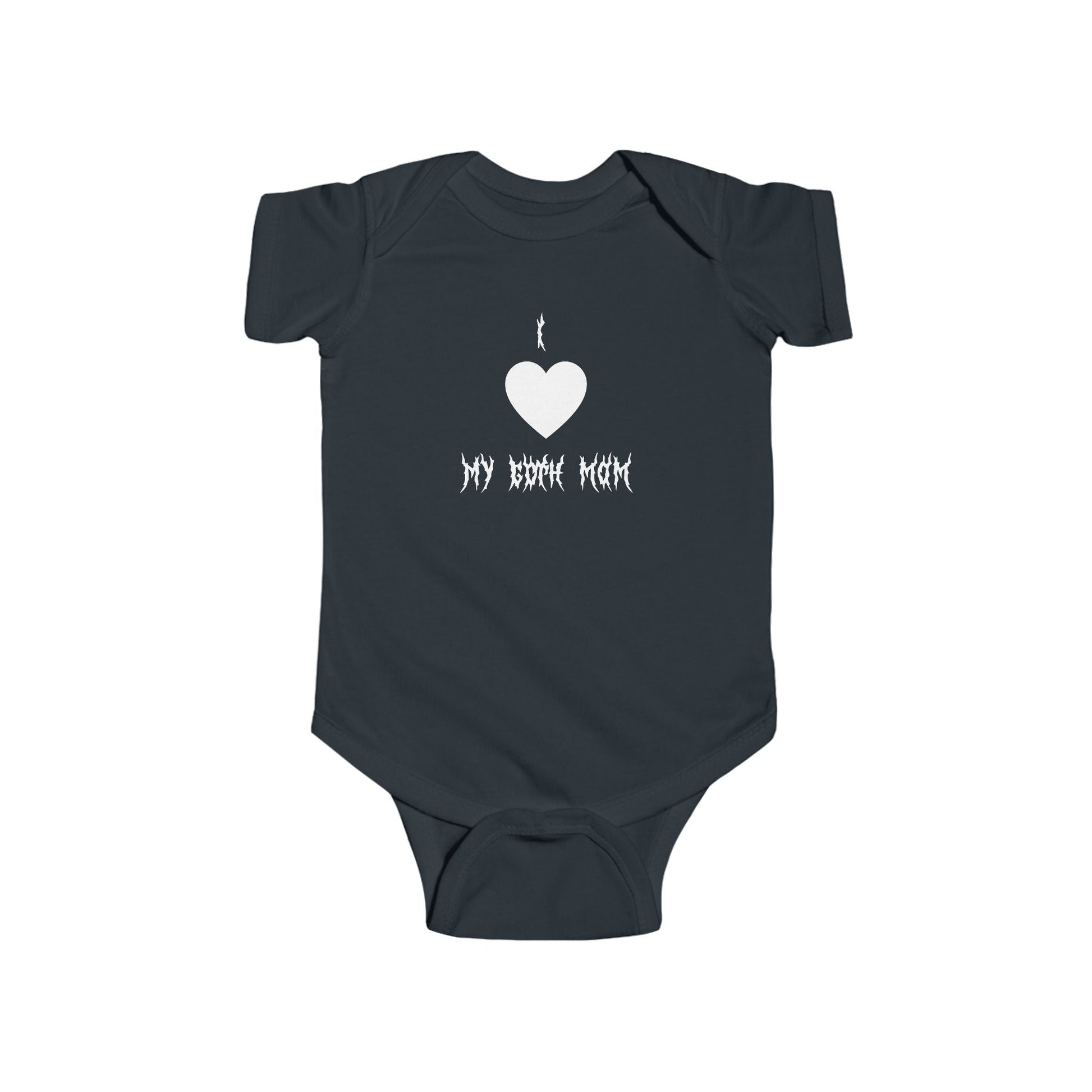 This I <3 my Goth Mom baby onesie is the perfect gift for your expecting goth friend! Printed white on a black onesie, this basic will be beloved by mom and baby alike! Baby clothing needs to be both durable and soft. With the infant fine jersey bodysuit, youths get just that. The fabric is 100% cotton for solid colors. For heather colors, polyester is included. There are seams along the sides of this product. All bindings are made with ribbed knitting for improved durability. There are plastic snaps at the cross closure for easy changing access.